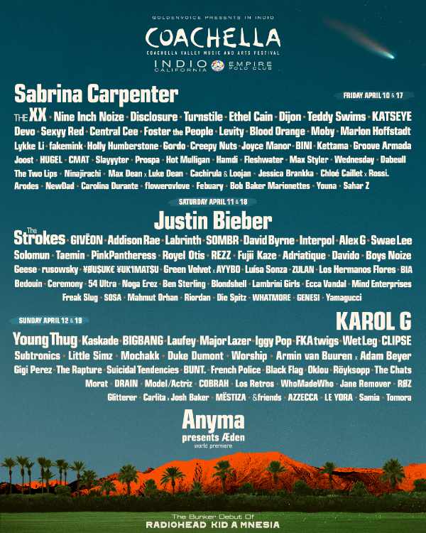 Friday nights belong to Sabrina Carpenter, stepping confidently into headliner territory, backed by an eclectic wave that includes The xx, Disclosure, Turnstile, Ethel Cain, Teddy Swims, Devo, Central Cee, Foster the People, Blood Orange, and electronic pioneer Moby. It’s the kind of day where you might pogo in the afternoon and sway at sunset.